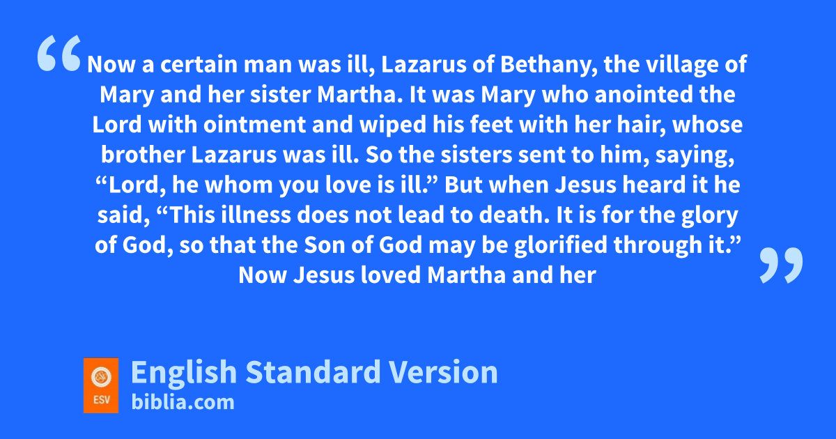 11 Now a certain man was ill, Lazarus of Bethany, the village of lMary and her sister Martha. 2 mIt was Mary who anointed the Lord with ointment and wiped his feet with her hair, whose brother Lazarus was ill. 3 So the sisters sent to him, saying, “Lord, nhe whom you love is ill.” 4 But when Jesus heard it he said, o“This illness does not lead to death. It is for pthe glory of God, so that the Son of God may be glorified through it.”
