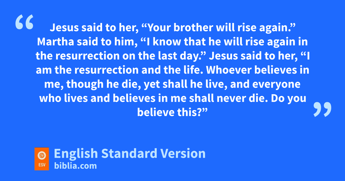 17 Now when Jesus came, he found that Lazarus had already been in the tomb bfour days. 18 Bethany was near Jerusalem, about two miles3 off, 19 and many of the Jews had come to Martha and Mary cto console them concerning their brother. 20 dSo when Martha heard that Jesus was coming, she went and met him, but Mary remained seated in the house. 21 Martha said to eJesus, “Lord, fif you had been here, my brother would not have died. 22 But even now I know that whatever you ask from God, gGod will give you.” 23 Jesus said to her, “Your brother will rise again.” 24 hMartha said to him, “I know that he will rise again in ithe resurrection on the last day.” 25 Jesus said to her, j“I am the resurrection and kthe life.4 Whoever believes in me, lthough he die, myet shall he live, 26 and everyone who lives and believes in me nshall never die. Do you believe this?” 27 She said to him, “Yes, Lord; oI believe that pyou are the Christ, the Son of God, qwho is coming into the world.”