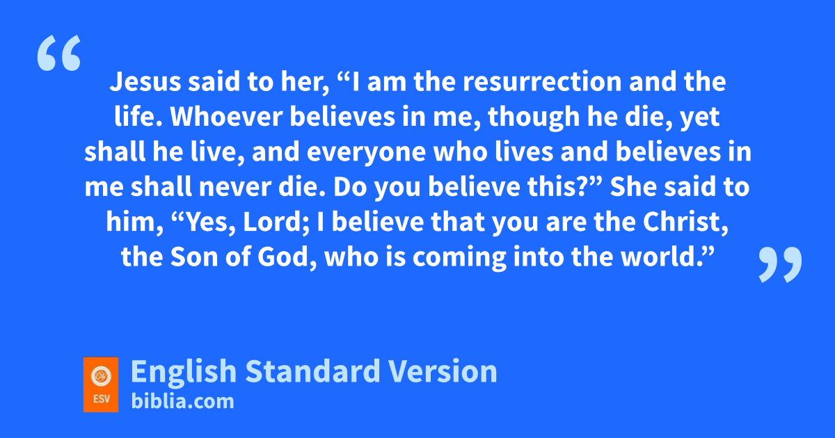 17 Now when Jesus came, he found that Lazarus had already been in the tomb bfour days. 18 Bethany was near Jerusalem, about two miles3 off, 19 and many of the Jews had come to Martha and Mary cto console them concerning their brother. 20 dSo when Martha heard that Jesus was coming, she went and met him, but Mary remained seated in the house. 21 Martha said to eJesus, “Lord, fif you had been here, my brother would not have died. 22 But even now I know that whatever you ask from God, gGod will give you.” 23 Jesus said to her, “Your brother will rise again.” 24 hMartha said to him, “I know that he will rise again in ithe resurrection on the last day.” 25 Jesus said to her, j“I am the resurrection and kthe life.4 Whoever believes in me, lthough he die, myet shall he live, 26 and everyone who lives and believes in me nshall never die. Do you believe this?” 27 She said to him, “Yes, Lord; oI believe that pyou are the Christ, the Son of God, qwho is coming into the world.”