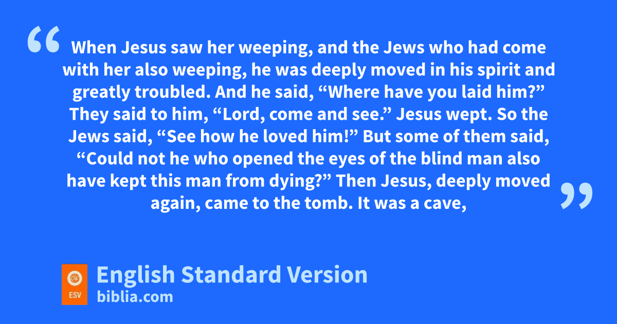 28 When she had said this, she went and called her sister Mary, saying in private, r“The Teacher is here and is calling for you.” 29 And when she heard it, she rose quickly and went to him. 30 Now Jesus had not yet come into the village, but was still in the place where Martha had met him. 31 When the Jews swho were with her in the house, consoling her, saw Mary rise quickly and go out, they followed her, supposing that she was going to the tomb to weep there. 32 Now when Mary came to where Jesus was and saw him, she fell at his feet, saying to him, t“Lord, if you had been here, my brother would not have died.” 33 When Jesus saw her weeping, and the Jews who had come with her also weeping, he uwas deeply moved5 in his spirit and vgreatly troubled. 34 And he said, “Where have you laid him?” They said to him, “Lord, come and see.” 35 wJesus wept. 36 So the Jews said, “See xhow he loved him!” 37 But some of them said, “Could not he ywho opened the eyes of the blind man zalso have kept this man from dying?”