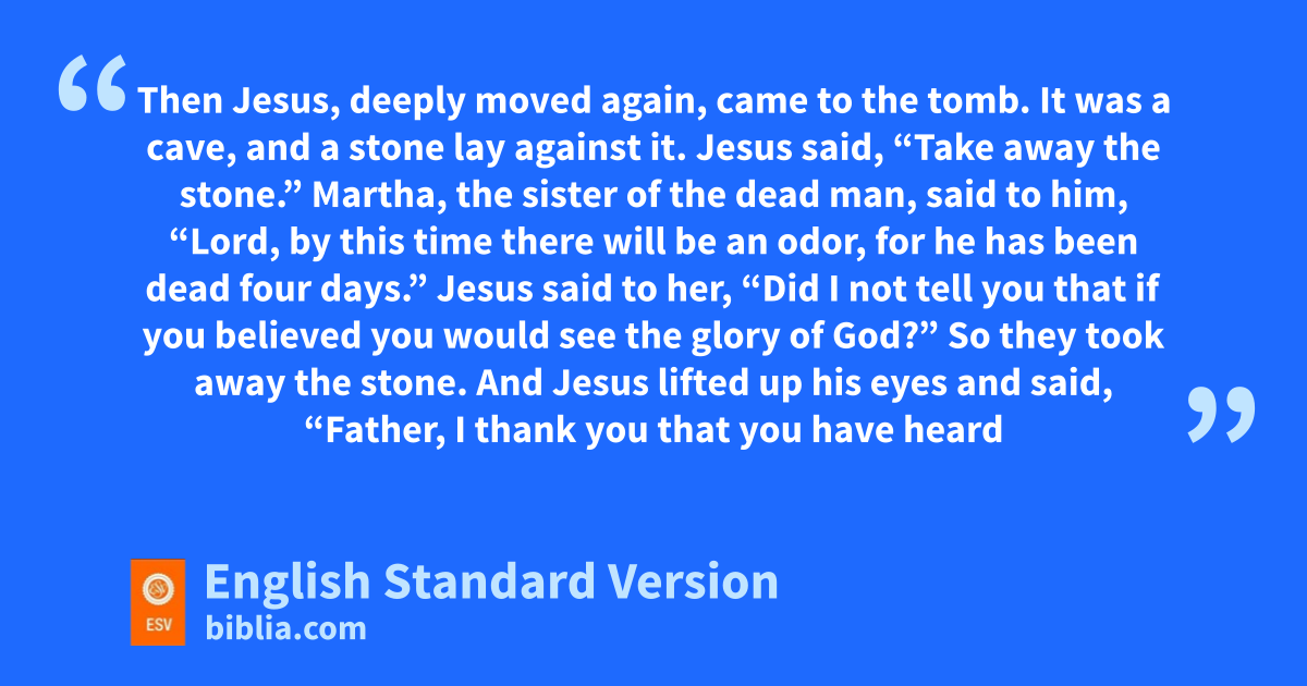 38 Then Jesus, adeeply moved again, came to the tomb. It was ba cave, and ca stone lay against it. 39 Jesus said, “Take away the stone.” Martha, the sister of the dead man, said to him, “Lord, by this time there will be an odor, for dhe has been dead four days.” 40 Jesus said to her, e“Did I not tell you that if you believed you would see fthe glory of God?” 41 So they took away the stone. And Jesus glifted up his eyes and said, “Father, I thank you that you have heard me. 42 hI knew that you always hear me, but I said this ion account of the people standing around, jthat they may believe that you sent me.” 43 When he had said these things, he cried out with a loud voice, “Lazarus, come out.” 44 kThe man who had died came out, lhis hands and feet bound with linen strips, and mhis face wrapped with a cloth. Jesus said to them, “Unbind him, and let him go.”