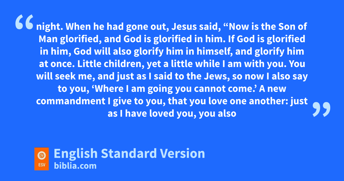 31 When he had gone out, Jesus said, n“Now is the Son of Man glorified, and oGod is glorified in him. 32 If God is glorified in him, pGod will also glorify him in himself, and qglorify him at once. 33 Little children, ryet a little while I am with you. You will seek me, and just sas I said to the Jews, so now I also say to you, ‘Where I am going you cannot come.’ 34 tA new commandment uI give to you, vthat you love one another: wjust as I have loved you, you also are to love one another. 35 xBy this all people will know that you are my disciples, if you have love for one another.”