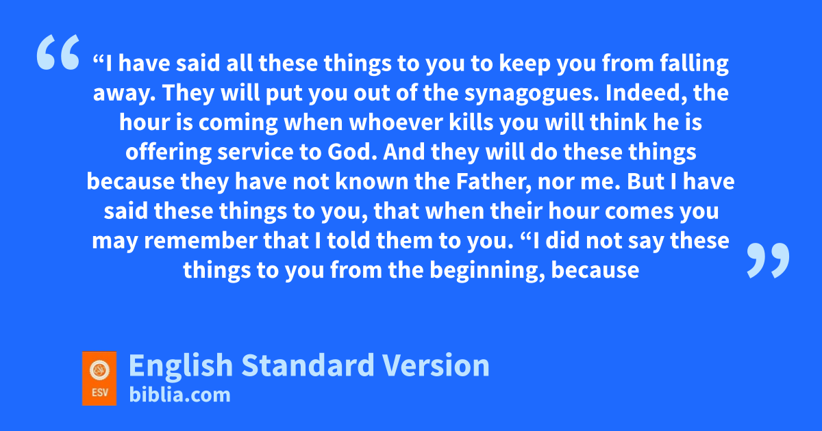 16 “I have said all these things to you to keep you from falling away. 2 xThey will put you out of the synagogues. Indeed, ythe hour is coming when zwhoever kills you will think he is offering service to God. 3 And they will do these things abecause they have not known the Father, nor me. 4 But bI have said these things to you, that when ctheir hour comes you may remember that I told them to you.
