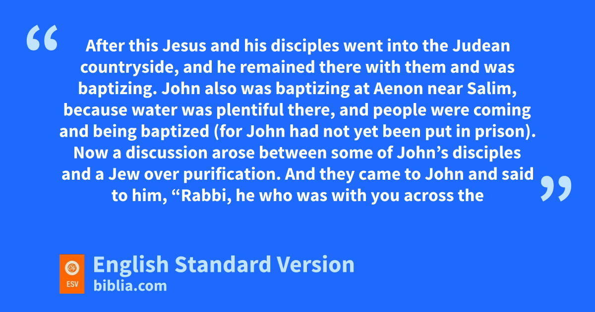 25 Now a discussion arose between some of John’s disciples and a Jew over zpurification. 26 And they came to John and said to him, a“Rabbi, he who was with you across the Jordan, bto whom you bore witness—look, he is baptizing, and call are going to him.” 27 John answered, d“A person cannot receive even one thing eunless it is given him ffrom heaven. 28 You yourselves bear me witness, that I said, g‘I am not the Christ, but hI have been sent before him.’ 29 iThe one who has the bride is the bridegroom. jThe friend of the bridegroom, who stands and hears him, krejoices greatly at the bridegroom’s voice. Therefore this joy of mine is now complete. 30 lHe must increase, but I must decrease.”10