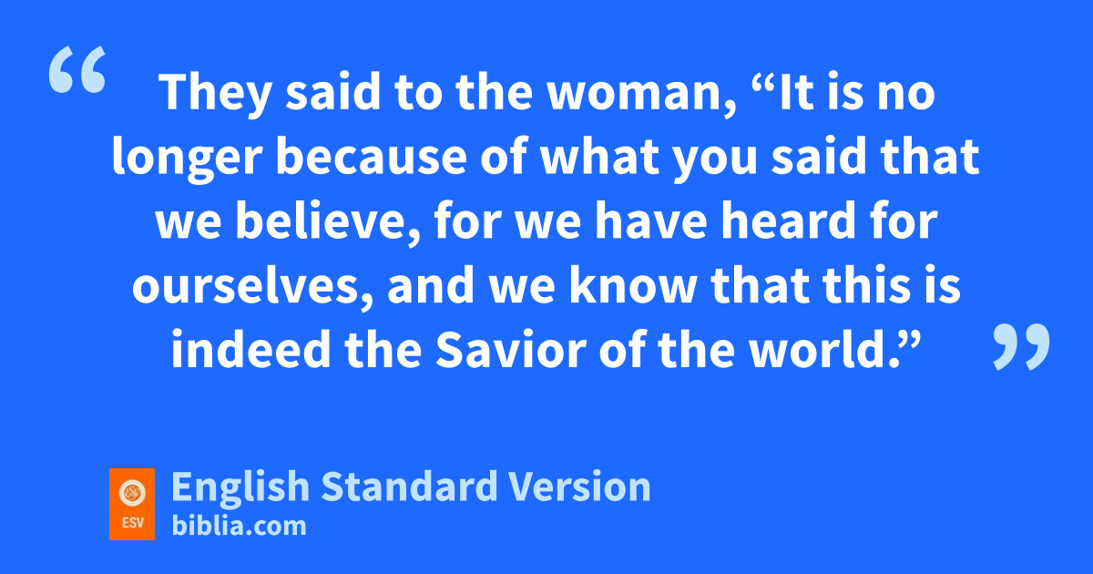 39 Many Samaritans wfrom that town believed in him xbecause of ythe woman’s testimony, “He told me all that I ever did.” 40 So when the Samaritans came to him, they asked him to stay with them, and he stayed there two days. 41 And many more believed zbecause of his word. 42 They said to the woman, “It is no longer because of what you said that we believe, for we have heard for ourselves, aand we know that this is indeed bthe Savior cof the world.”