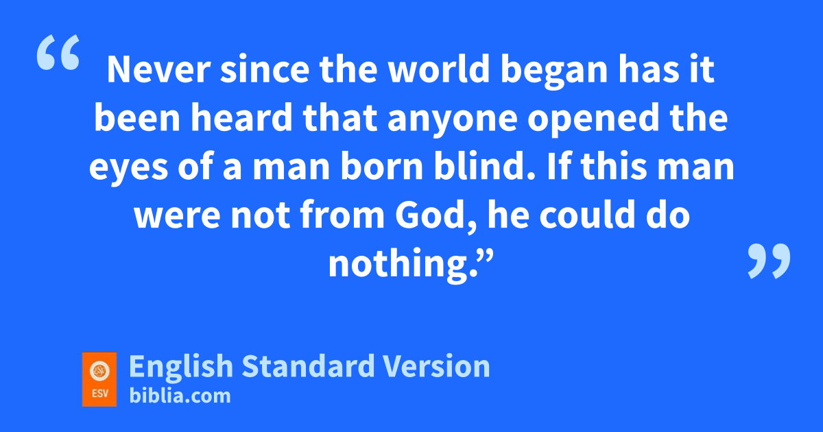 24 So for the second time they called the man who had been blind and said to him, d“Give glory to God. We know that ethis man is a sinner.” 25 He answered, “Whether he is a sinner I do not know. One thing I do know, that though I fwas blind, now I see.” 26 They said to him, “What did he do to you? How did he open your eyes?” 27 He answered them, g“I have told you already, and you would not listen. Why do you want to hear it again? Do you also want to become his disciples?” 28 And they reviled him, saying, “You are his disciple, but hwe are disciples of Moses. 29 We know that God has spoken to Moses, but as for this man, iwe do not know where he comes from.” 30 The man answered, “Why, this is jan amazing thing! kYou do not know where he comes from, and yet he opened my eyes. 31 We know that lGod does not listen to sinners, but mif anyone is a worshiper of God and does his will, God listens to him. 32 Never since the world began has it been heard that anyone opened the eyes of a man born blind. 33 nIf this man were not from God, he could do nothing.” 34 They answered him, o“You were born in utter sin, and would you teach us?” And they pcast him out.