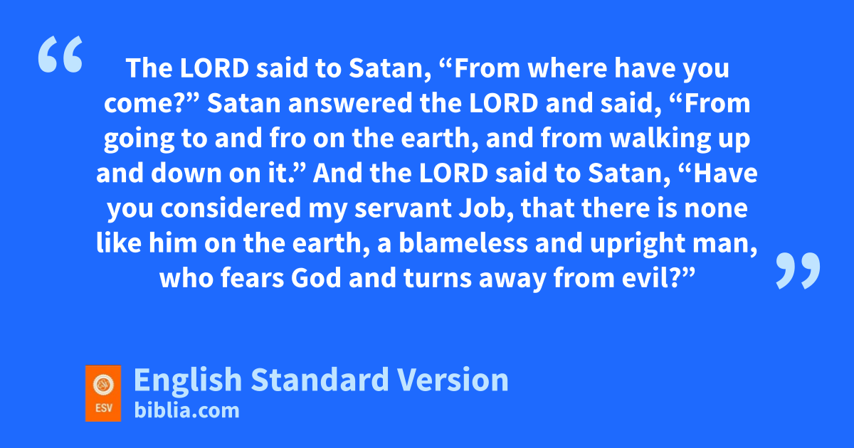 6 Now there was a day when kthe sons of God came to present themselves before the Lord, and lSatan2 also came among them. 7 The Lord said to Satan, “From where have you come?” Satan answered the Lord and said, “From mgoing to and fro on the earth, and from walking up and down on it.” 8 And the Lord said to Satan, “Have you nconsidered my oservant Job, that there is none like him on the earth, pa blameless and upright man, who fears God and turns away from evil?” 9 Then Satan answered the Lord and said, “Does Job fear God for no reason? 10 Have you not put qa hedge around him and his house and all that he has, on every side? You have rblessed the work of his hands, and his possessions have increased in the land. 11 But sstretch out your hand and ttouch all that he has, and he will ucurse you vto your face.” 12 And the Lord said to Satan, “Behold, all that he has is in your hand. Only against him do not stretch out your hand.” So Satan went out from the presence of the Lord.
