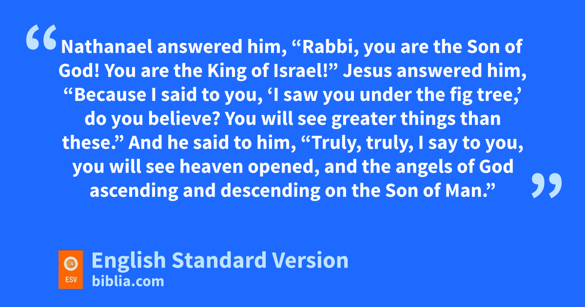 43 qThe next day Jesus decided rto go to Galilee. He found Philip and said to him, “Follow me.” 44 Now sPhilip was from Bethsaida, the city of Andrew and Peter. 45 Philip found tNathanael and said to him, “We have found him of whom uMoses in the Law and also the prophets wrote, Jesus vof Nazareth, wthe son of Joseph.” 46 Nathanael said to him, x“Can anything good come out of Nazareth?” Philip said to him, “Come and see.” 47 Jesus saw Nathanael coming toward him and said of him, “Behold, yan Israelite indeed, zin whom there is no deceit!” 48 Nathanael said to him, “How ado you know me?” Jesus answered him, “Before Philip called you, when you were under the fig tree, I saw you.” 49 Nathanael answered him, b“Rabbi, cyou are the Son of God! You are the dKing of Israel!” 50 Jesus answered him, “Because I said to you, ‘I saw you under the fig tree,’ do you believe? You will see greater things than these.” 51 And he said to him, “Truly, truly, I say to you,13 you will see eheaven opened, and fthe angels of God ascending and descending on gthe Son of Man.”