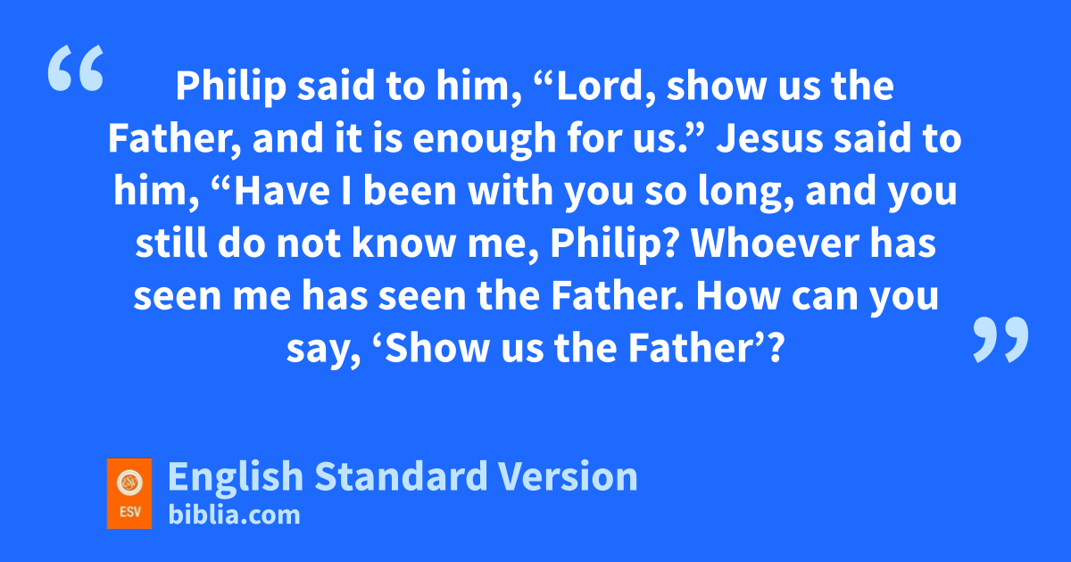 8 rPhilip said to him, “Lord, sshow us the Father, and it is enough for us.” 9 Jesus said to him, “Have I been with you so long, and you still do not know me, Philip? tWhoever has seen me has seen the Father. How can you say, ‘Show us the Father’? 10 Do you not believe that uI am in the Father and the Father is in me? The words that I say to you vI do not speak on my own authority, but the Father who dwells in me does his works. 11 Believe me that uI am in the Father and the Father is in me, or else wbelieve on account of the works themselves.