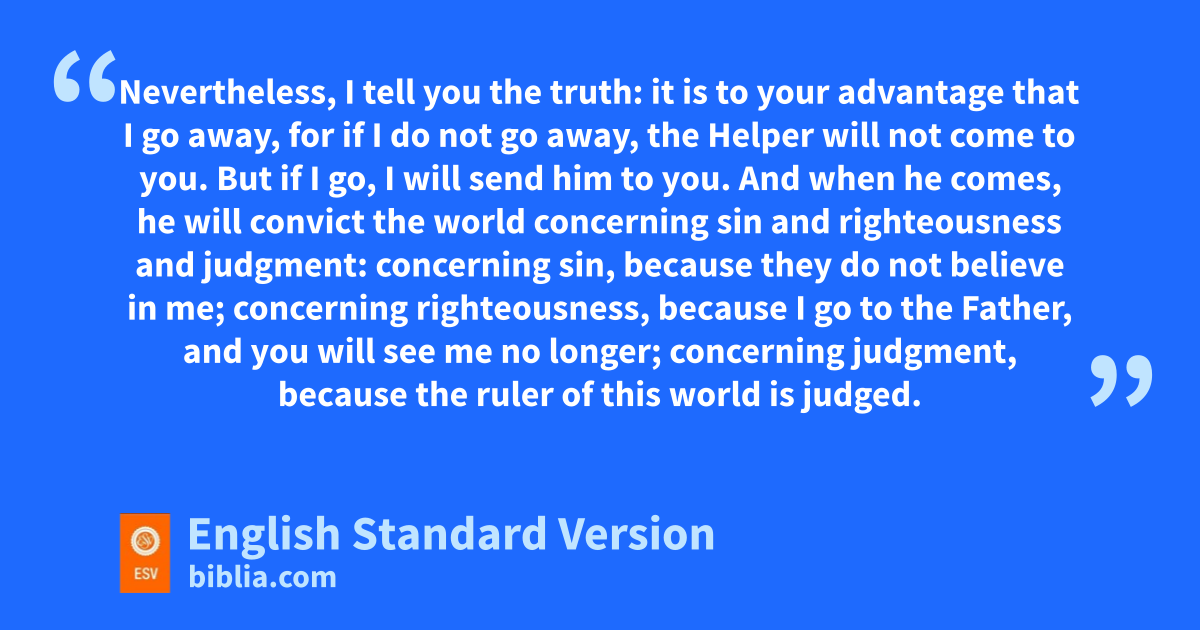 “I did not say these things to you from the beginning, dbecause I was with you. 5 But now eI am going to him who sent me, and fnone of you asks me, ‘Where are you going?’ 6 But because I have said these things to you, gsorrow has filled your heart. 7 Nevertheless, I tell you the truth: it is to your advantage that I go away, for hif I do not go away, ithe Helper will not come to you. But jif kI go, lI will send him to you. 8 mAnd when he comes, he will nconvict the world concerning sin and righteousness and judgment: 9 concerning sin, obecause they do not believe in me; 10 pconcerning righteousness, qbecause I go to the Father, and you will see me no longer; 11 rconcerning judgment, because the ruler of this world sis judged.
