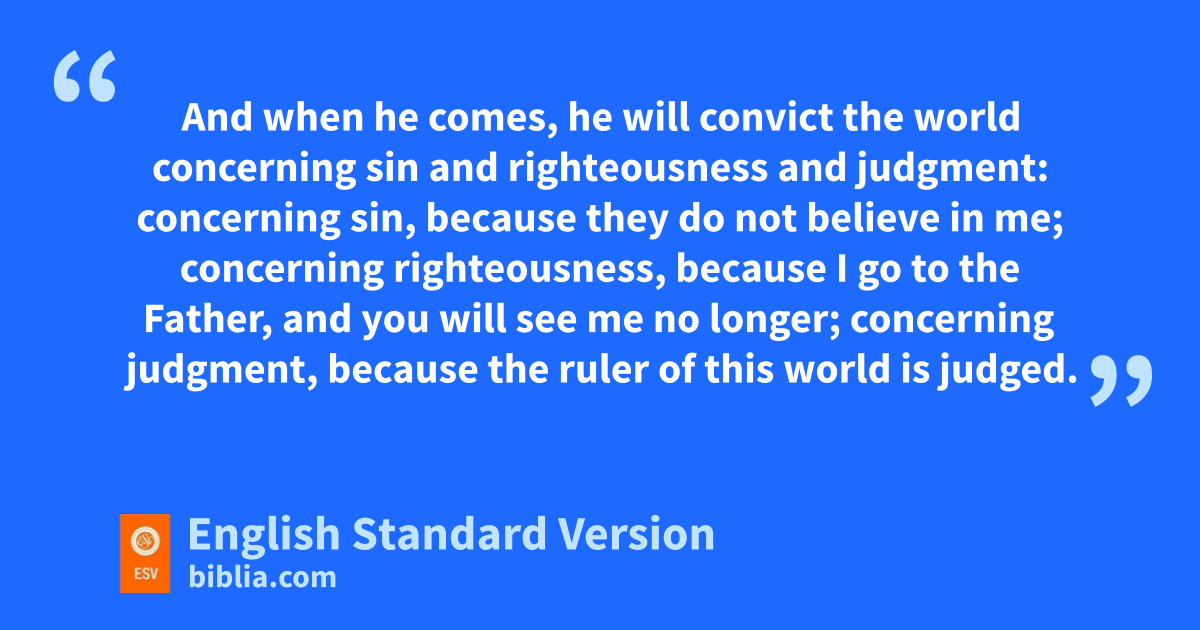 “I did not say these things to you from the beginning, dbecause I was with you. 5 But now eI am going to him who sent me, and fnone of you asks me, ‘Where are you going?’ 6 But because I have said these things to you, gsorrow has filled your heart. 7 Nevertheless, I tell you the truth: it is to your advantage that I go away, for hif I do not go away, ithe Helper will not come to you. But jif kI go, lI will send him to you. 8 mAnd when he comes, he will nconvict the world concerning sin and righteousness and judgment: 9 concerning sin, obecause they do not believe in me; 10 pconcerning righteousness, qbecause I go to the Father, and you will see me no longer; 11 rconcerning judgment, because the ruler of this world sis judged.