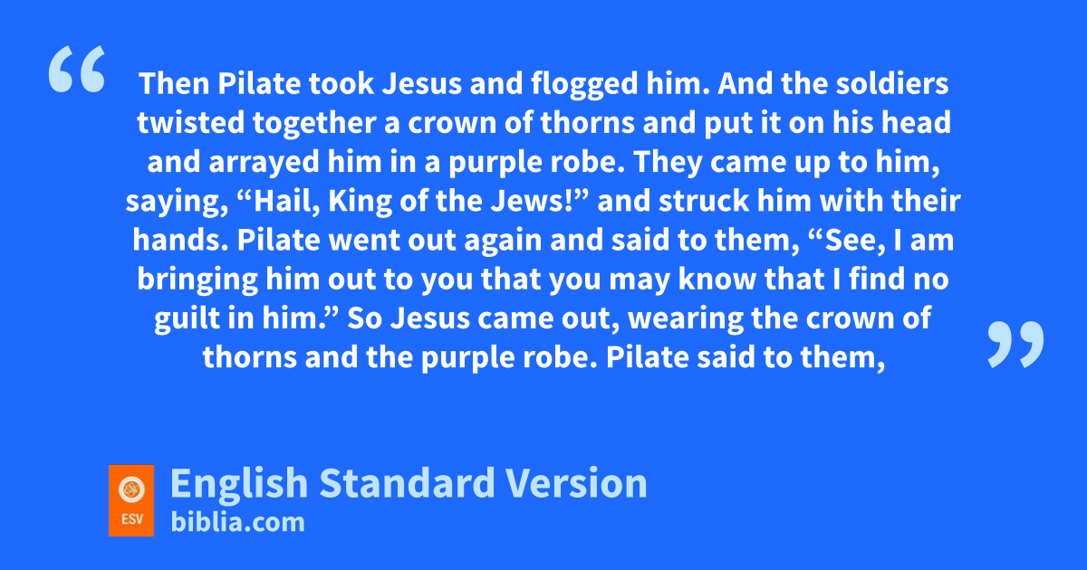 19 Then Pilate took Jesus and qflogged him. 2 rAnd the soldiers twisted together a crown of thorns and put it on his head and arrayed him in a purple robe. 3 They came up to him, saying, “Hail, King of the Jews!” and struck him with their hands. 4 Pilate went out again and said to them, “See, I am bringing him out to you that you may know that sI find no guilt in him.” 5 So Jesus came out, wearing tthe crown of thorns and the purple robe. Pilate said to them, u“Behold the man!” 6 When the chief priests and the officers saw him, they cried out, “Crucify him, crucify him!” Pilate said to them, v“Take him yourselves and crucify him, for wI find no guilt in him.” 7 The Jews1 answered him, “We have a law, and xaccording to that law he ought to die because yhe has made himself the Son of God.” 8 When Pilate heard this statement, zhe was even more afraid. 9 aHe entered his headquarters again and said to Jesus, b“Where are you from?” But cJesus gave him no answer. 10 So Pilate said to him, “You will not speak to me? Do you not know that I have authority to release you and authority to crucify you?” 11 Jesus answered him, d“You would have no authority over me at all unless it had been given you from above. Therefore ehe who delivered me over to you fhas the greater sin.”