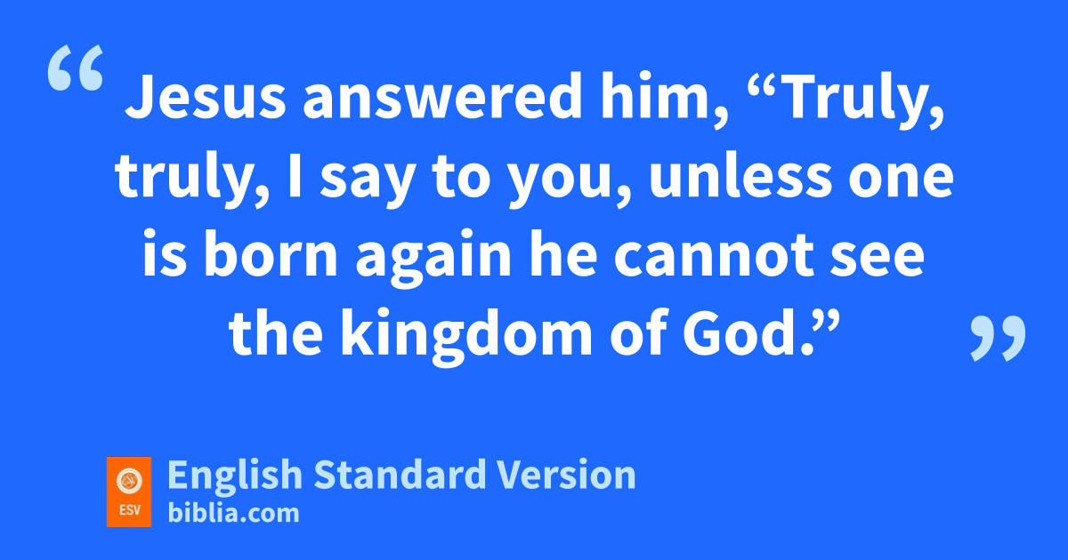 3 Now there was a man of the Pharisees named hNicodemus, ia ruler of the Jews. 2 This man came to Jesus1 jby night and said to him, k“Rabbi, lwe know that you are a teacher come from God, for no one can do these signs that you do munless God is with him.” 3 Jesus answered him, “Truly, truly, I say to you, unless one is nborn oagain2 he cannot psee the kingdom of God.” 4 Nicodemus said to him, “How can a man be born when he is old? Can he enter a second time into his mother’s womb and be born?” 5 Jesus answered, “Truly, truly, I say to you, unless one is born qof water and the Spirit, he cannot enter the kingdom of God. 6 rThat which is born of the flesh is sflesh, and that which is born of the Spirit is spirit.3 7 tDo not marvel that I said to you, ‘You4 must be born uagain.’ 8 vThe wind5 blows wwhere it wishes, and you hear its sound, but you do not know where it comes from or where it goes. So it is with everyone who is born of the Spirit.”