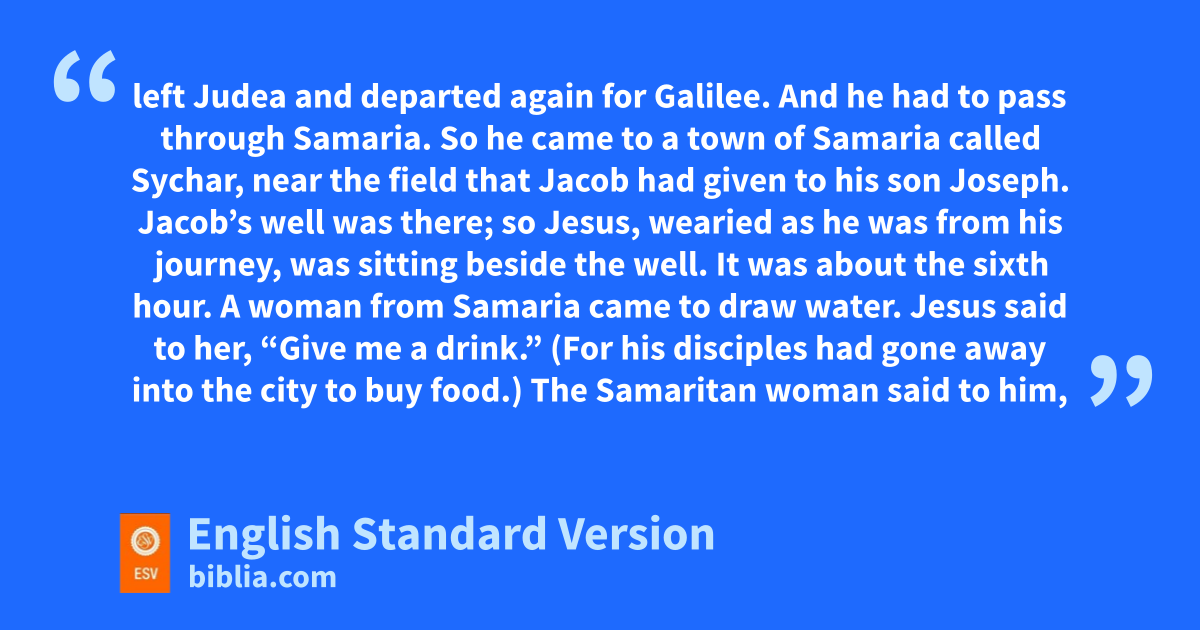 7 A woman from Samaria came to draw water. Jesus said to her, f“Give me a drink.” 8 (For his disciples had gone away into the city to buy food.) 9 The Samaritan woman said to him, “How is it that you, a Jew, ask for a drink from me, a woman of Samaria?” (gFor Jews have no dealings with Samaritans.) 10 Jesus answered her, “If you knew the gift of God, and who it is that is saying to you, ‘Give me a drink,’ you would have asked him, and he would have given you hliving water.” 11 The woman said to him, “Sir, you have nothing to draw water with, and the well is deep. Where do you get that living water? 12 iAre you greater than our father Jacob? jHe gave us the well and drank from it himself, as did his sons and his livestock.” 13 Jesus said to her, “Everyone who drinks of this water will be thirsty again, 14 but kwhoever drinks of the water that I will give him lwill never be thirsty again.2 The water that I will give him will become min him a spring of water welling up to eternal life.” 15 The woman said to him, “Sir, ngive me this water, so that I will not be thirsty or have to come here to draw water.”