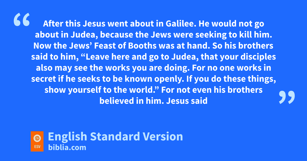 7 After this Jesus went about in Galilee. He would not go about in Judea, because pthe Jews1 were seeking to kill him. 2 Now qthe Jews’ Feast of rBooths was at hand. 3 sSo his brothers2 said to him, “Leave here and go to Judea, that your disciples also may see the works you are doing. 4 For no one works in secret if he seeks to be known openly. If you do these things, tshow yourself to the world.” 5 uFor not even vhis brothers believed in him. 6 Jesus said to them, w“My time has not yet come, but your time is always here. 7 The world cannot hate you, but xit hates me because I testify about it that yits works are evil. 8 You go up to the feast. I am not3 going up to this feast, for zmy time has not yet fully come.” 9 After saying this, he remained in Galilee.