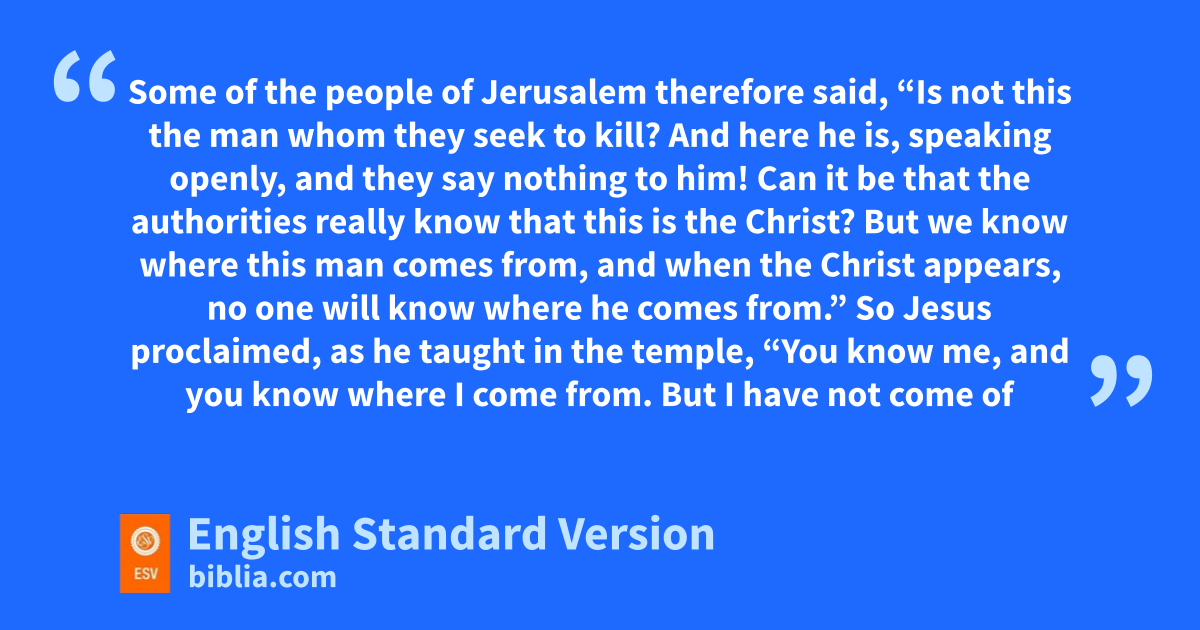 25 Some of the people of Jerusalem therefore said, “Is not this the man whom xthey seek to kill? 26 And here he is, yspeaking openly, and they say nothing to him! Can it be that zthe authorities really know that this is the Christ? 27 But awe know bwhere this man comes from, and when the Christ appears, cno one will know where he comes from.” 28 So Jesus proclaimed, das he taught in the temple, a“You know me, and you know where I come from. But eI have not come of my own accord. fHe who sent me is true, gand him you do not know. 29 hI know him, for I come ifrom him, and jhe sent me.” 30 kSo they were seeking to arrest him, but lno one laid a hand on him, mbecause his hour had not yet come. 31 Yet nmany of the people believed in him. They said, o“When the Christ appears, will he do more signs than this man has done?”