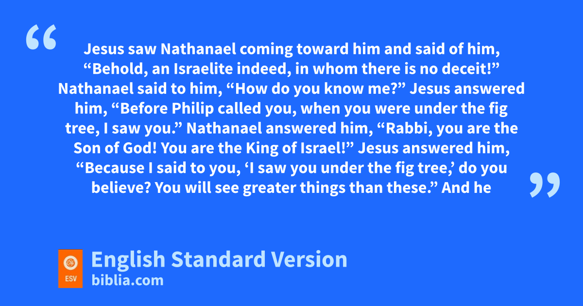 43 qThe next day Jesus decided rto go to Galilee. He found Philip and said to him, “Follow me.” 44 Now sPhilip was from Bethsaida, the city of Andrew and Peter. 45 Philip found tNathanael and said to him, “We have found him of whom uMoses in the Law and also the prophets wrote, Jesus vof Nazareth, wthe son of Joseph.” 46 Nathanael said to him, x“Can anything good come out of Nazareth?” Philip said to him, “Come and see.” 47 Jesus saw Nathanael coming toward him and said of him, “Behold, yan Israelite indeed, zin whom there is no deceit!” 48 Nathanael said to him, “How ado you know me?” Jesus answered him, “Before Philip called you, when you were under the fig tree, I saw you.” 49 Nathanael answered him, b“Rabbi, cyou are the Son of God! You are the dKing of Israel!” 50 Jesus answered him, “Because I said to you, ‘I saw you under the fig tree,’ do you believe? You will see greater things than these.” 51 And he said to him, “Truly, truly, I say to you,13 you will see eheaven opened, and fthe angels of God ascending and descending on gthe Son of Man.”