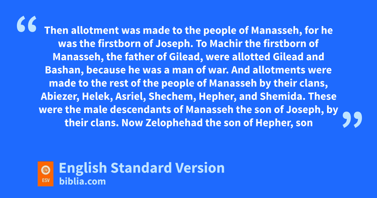 17 Then allotment was made to the people of Manasseh, for he was tthe firstborn of Joseph. To uMachir the firstborn of Manasseh, the father of Gilead, vwere allotted Gilead and Bashan, because he was a man of war. 2 And allotments were made wto the rest of the people of Manasseh by their clans, Abiezer, Helek, Asriel, Shechem, Hepher, and Shemida. These were the male descendants of Manasseh the son of Joseph, by their clans.