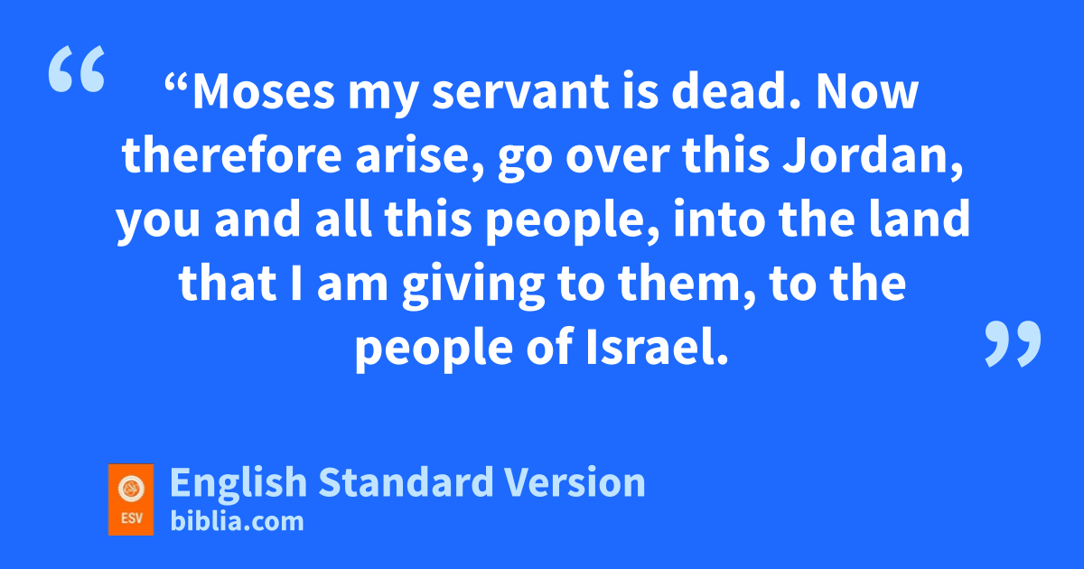 1 After the death of Moses the aservant of the Lord, the Lord said to Joshua the son of Nun, Moses’ bassistant, 2 “Moses my servant is dead. Now therefore arise, go over this Jordan, you and all this people, into the land that I am giving to them, to the people of Israel. 3 cEvery place that the sole of your foot will tread upon I have given to you, just as I promised to Moses. 4 dFrom the wilderness and this Lebanon as far as the great river, the river Euphrates, all the land of the Hittites to the Great Sea toward the going down of the sun shall be your territory. 5 eNo man shall be able to stand before you all the days of your life. Just fas I was with Moses, so gI will be with you. hI will not leave you or forsake you. 6 iBe strong and courageous, for you shall cause this people to inherit the land that I swore to their fathers to give them. 7 Only be strong and jvery courageous, being careful to do according to all the law kthat Moses my servant commanded you. lDo not turn from it to the right hand or to the left, that you may have good success1 wherever you go. 8 This Book of the Law shall not depart from your mouth, but myou shall meditate on it day and night, so that you may be careful to do according to all that is written in it. For then you will make your way prosperous, and then you will have good success. 9 Have I not commanded you? nBe strong and courageous. oDo not be frightened, and do not be dismayed, for the Lord your God is with you wherever you go.”