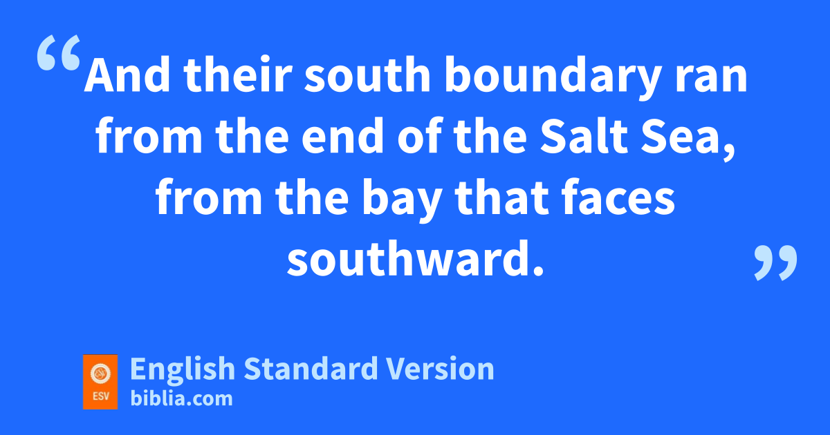 15 The allotment for the tribe of the people of Judah according to their clans reached southward hto the boundary of Edom, to ithe wilderness of Zin at the farthest south. 2 And their south boundary ran from the end of the hSalt Sea, from the bay that faces southward. 3 It goes out southward of jthe ascent of Akrabbim, passes along to Zin, and goes up south of Kadesh-barnea, along by Hezron, up to Addar, turns about to Karka, 4 passes along to Azmon, goes out by kthe Brook of Egypt, and comes to its end at the sea. This shall be your south boundary. 5 And the east boundary is the hSalt Sea, to the mouth of the Jordan. And the boundary on the north side runs from the bay of the sea at the mouth of the Jordan. 6 And the boundary goes up to lBeth-hoglah and passes along north of mBeth-arabah. And the boundary goes up to nthe stone of Bohan the son of Reuben. 7 And the boundary goes up to Debir from othe Valley of Achor, and so northward, turning toward Gilgal, which is opposite pthe ascent of Adummim, which is on the south side of the valley. And the boundary passes along to the waters of pEn-shemesh and ends at qEn-rogel. 8 Then the boundary goes up by rthe Valley of the Son of Hinnom at the southern shoulder of the Jebusite (sthat is, Jerusalem). And the boundary goes up to the top of the mountain that lies over against the Valley of Hinnom, on the west, at the northern end of the Valley tof Rephaim. 9 Then the boundary extends from the top of the mountain uto the spring of the waters of Nephtoah, and from there to the cities of Mount Ephron. Then the boundary bends around to Baalah (vthat is, Kiriath-jearim). 10 And the boundary circles west of Baalah to Mount Seir, passes along to the northern shoulder of Mount Jearim (that is, Chesalon), and goes down to wBeth-shemesh and passes along by xTimnah. 11 The boundary goes out yto the shoulder of the hill north of Ekron, then the boundary bends around to Shikkeron and passes along to Mount zBaalah and goes out to Jabneel. Then the boundary comes to an end at the sea. 12 And the west boundary was athe Great Sea with its coastline. This is the boundary around the people of Judah according to their clans.
