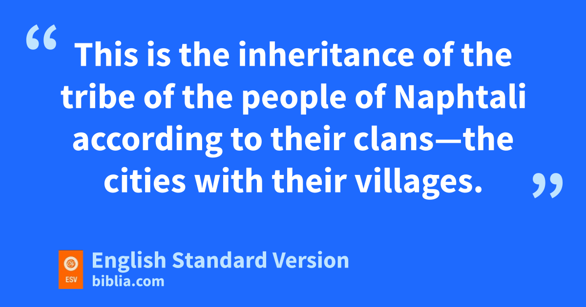32 The sixth lot came out for the people of Naphtali, for the people of Naphtali, according to their clans. 33 And their boundary ran from Heleph, from zthe oak in Zaanannim, and Adami-nekeb, and Jabneel, as far as Lakkum, and it ended at the Jordan. 34 Then the boundary turns awestward to Aznoth-tabor and goes from there to Hukkok, touching Zebulun at the south and Asher on the west and Judah on the east at the Jordan. 35 The fortified cities are Ziddim, Zer, Hammath, Rakkath, bChinnereth, 36 Adamah, Ramah, cHazor, 37 Kedesh, Edrei, En-hazor, 38 Yiron, Migdal-el, Horem, Beth-anath, and Beth-shemesh—nineteen cities with their villages. 39 This is the inheritance of the tribe of the people of Naphtali according to their clans—the cities with their villages.