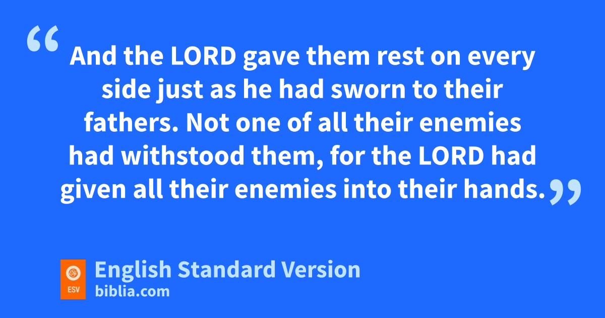 43 rThus the Lord gave to Israel all the land that he swore to give to their fathers. And they took possession of it, and they settled there. 44 sAnd the Lord gave them rest on every side just as he had sworn to their fathers. tNot one of all their enemies had withstood them, for uthe Lord had given all their enemies into their hands. 45 vNot one word of all the good promises that the Lord had made to the house of Israel had failed; all came to pass.