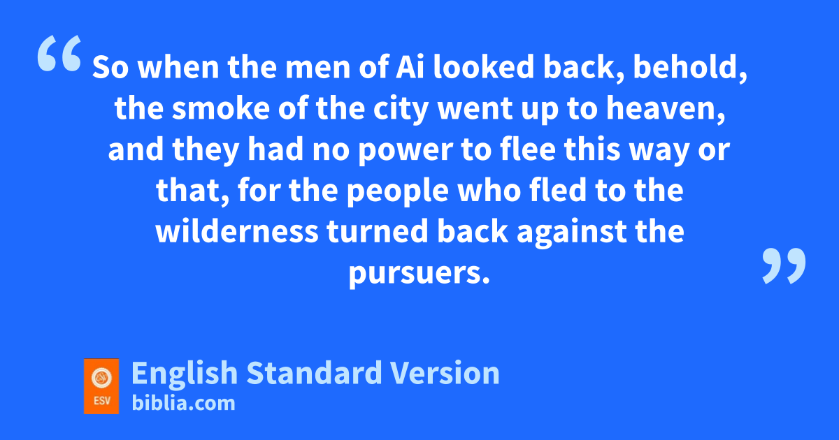 18 Then the Lord said to Joshua, s“Stretch out the javelin that is in your hand toward Ai, for I will give it into your hand.” And Joshua stretched out the javelin that was in his hand toward the city. 19 And the men in the ambush rose quickly out of their place, and as soon as he had stretched out his hand, they ran and entered the city and captured it. And they hurried to set the city on fire. 20 So when the men of Ai looked back, behold, the smoke of the city went up to heaven, and they had no power to flee this way or that, for the people who fled to the wilderness turned back against the pursuers. 21 And when Joshua and all Israel saw that the ambush had captured the city, and that the smoke of the city went up, then they turned back and struck down the men of Ai. 22 And the others came out from the city against them, so they were in the midst of Israel, some on this side, and some on that side. And Israel struck them down, until there was tleft none that survived or escaped. 23 But the king of Ai they took alive, and brought him near to Joshua.