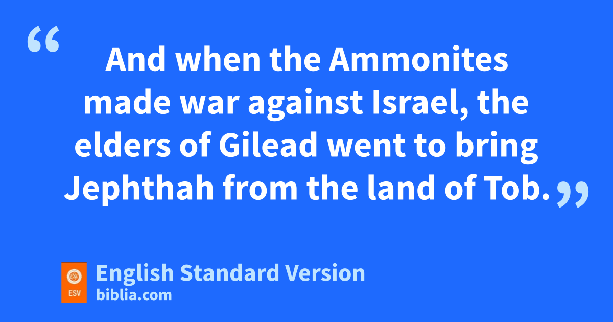 4 After a time the Ammonites made war against Israel. 5 And when the Ammonites made war against Israel, the elders of Gilead went to bring Jephthah from the land of fTob. 6 And they said to Jephthah, “Come and be our leader, that we may fight against the Ammonites.” 7 But Jephthah said to the elders of Gilead, “Did you not hate me and drive me out of my father’s house? Why have you come to me now when you are in distress?” 8 And the elders of Gilead said to Jephthah, “That is why we have turned to you now, that you may go with us and fight against the Ammonites and hbe our head over all the inhabitants of Gilead.” 9 Jephthah said to the elders of Gilead, “If you bring me home again to fight against the Ammonites, and the Lord gives them over to me, I will be your head.” 10 And the elders of Gilead said to Jephthah, i“The Lord will be witness between us, if we do not do as you say.” 11 So Jephthah went with the elders of Gilead, and the people jmade him head and leader over them. And Jephthah spoke all his words kbefore the Lord at lMizpah.