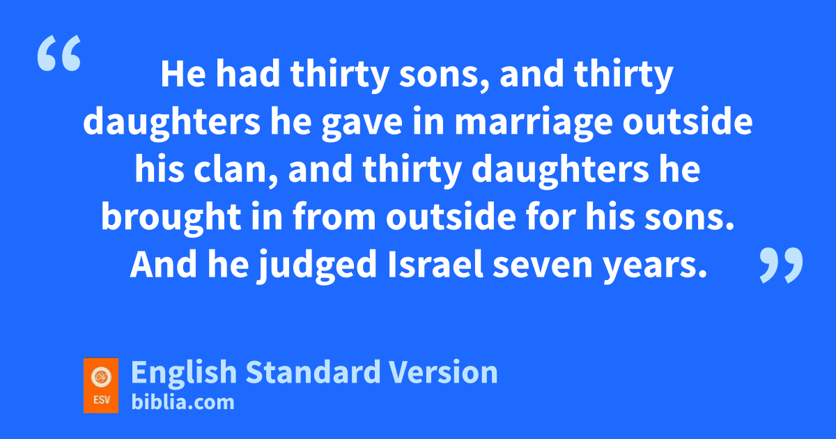 8 After him Ibzan of Bethlehem judged Israel. 9 He had thirty sons, and thirty daughters he gave in marriage outside his clan, and thirty daughters he brought in from outside for his sons. And he judged Israel seven years. 10 Then Ibzan died and was buried at Bethlehem.