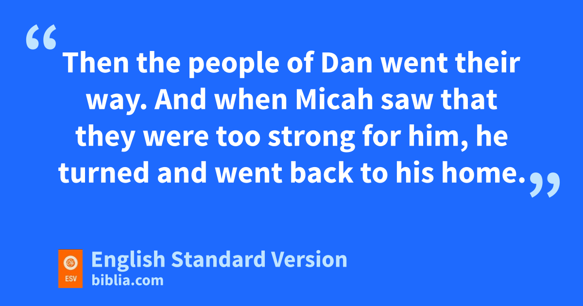21 So they turned and departed, putting the little ones and the livestock and lthe goods in front of them. 22 When they had gone a distance from the home of Micah, the men who were in the houses near Micah’s house were called out, and they overtook the people of Dan. 23 And they shouted to the people of Dan, who turned around and said to Micah, “What is the matter with you, that you come with such a company?” 24 And he said, m“You take my gods that I made and the priest, and go away, and what have I left? How then do you ask me, ‘What is the matter with you?’ ” 25 And the people of Dan said to him, “Do not let your voice be heard among us, lest angry fellows fall upon you, and you lose your life with the lives of your household.” 26 Then the people of Dan went their way. And when Micah saw that they were too strong for him, he turned and went back to his home.