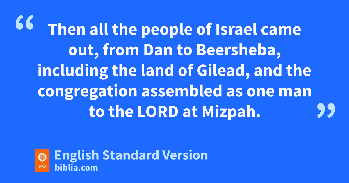 20 Then yall the people of Israel came out, zfrom Dan to Beersheba, including the land of Gilead, and the congregation assembled as one man to the Lord at aMizpah. 2 And the bchiefs of all the people, of all the tribes of Israel, presented themselves in the assembly of the people of God, 400,000 men on foot cthat drew the sword. 3 (Now the people of Benjamin heard that the people of Israel had gone up to Mizpah.) And the people of Israel said, “Tell us, how did this evil happen?” 4 And the Levite, the husband of the woman who was murdered, answered and said, d“I came to Gibeah that belongs to Benjamin, I and my concubine, to spend the night. 5 eAnd the leaders of Gibeah rose against me and surrounded the house against me by night. They meant to kill me, and they violated my concubine, and she is dead. 6 fSo I took hold of my concubine and cut her in pieces and sent her throughout all the country of the inheritance of Israel, for they have committed abomination and goutrage in Israel. 7 Behold, you people of Israel, all of you, hgive your advice and counsel here.”