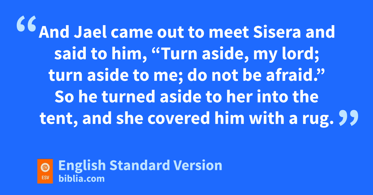 17 But Sisera fled away on foot to the tent of Jael, the wife of Heber the Kenite, for there was peace between Jabin the king of Hazor and the house of Heber the Kenite. 18 And Jael came out to meet Sisera and said to him, “Turn aside, my lord; turn aside to me; do not be afraid.” So he turned aside to her into the tent, and she covered him with a rug. 19 And he said to her, “Please give me a little water to drink, for I am thirsty.” So she opened ta skin of milk and gave him a drink and covered him. 20 And he said to her, “Stand at the opening of the tent, and if any man comes and asks you, ‘Is anyone here?’ say, ‘No.’ ” 21 But Jael the wife of Heber took a tent peg, and took a hammer in her hand. Then she went softly to him and drove the peg into his temple until it went down into the ground while he was lying fast asleep from weariness. So he died. 22 And behold, as Barak was pursuing Sisera, Jael went out to meet him and said to him, “Come, and I will show you the man whom you are seeking.” So he went in to her tent, and there lay Sisera dead, with the tent peg in his temple.