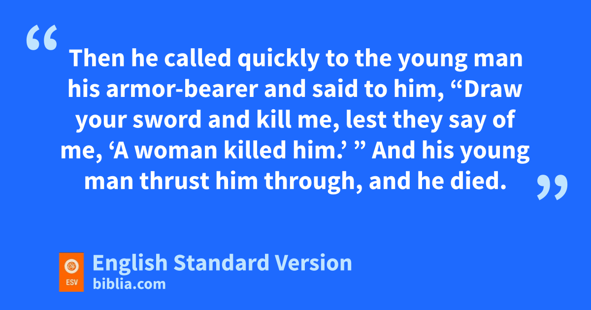 50 Then Abimelech went to Thebez and encamped against Thebez and captured it. 51 But there was a strong tower within the city, and all the men and women and all the leaders of the city fled to it and shut themselves in, and they went up to the roof of the tower. 52 And Abimelech came to the tower and fought against it and drew near to the door of the tower to burn it with fire. 53 dAnd a certain woman threw an upper millstone on Abimelech’s head and crushed his skull. 54 eThen he called quickly to the young man his armor-bearer and said to him, “Draw your sword and kill me, lest they say of me, ‘A woman killed him.’ ” And his young man thrust him through, and he died. 55 And when the men of Israel saw that Abimelech was dead, everyone departed to his home. 56 fThus God returned the evil of Abimelech, which he committed against his father in killing his seventy brothers. 57 And God also made all the evil of the men of Shechem return on their heads, and upon them came gthe curse of Jotham the son of Jerubbaal.