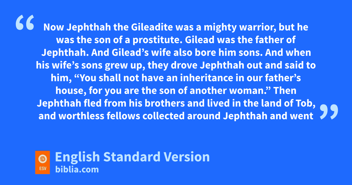 11 Now dJephthah the Gileadite was ea mighty warrior, but he was the son of a prostitute. Gilead was the father of Jephthah. 2 And Gilead’s wife also bore him sons. And when his wife’s sons grew up, they drove Jephthah out and said to him, “You shall not have an inheritance in our father’s house, for you are the son of another woman.” 3 Then Jephthah fled from his brothers and lived in the land of fTob, and gworthless fellows collected around Jephthah and went out with him.
