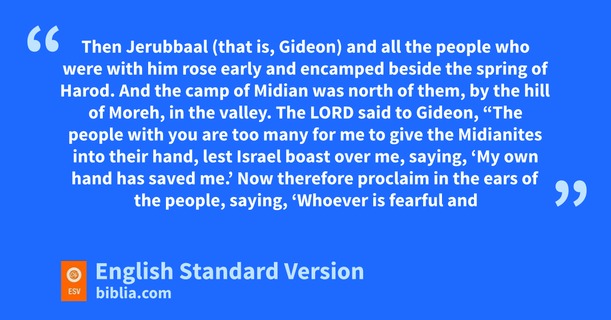 2 The Lord said to Gideon, “The people with you are too many for me to give the Midianites into their hand, dlest Israel boast over me, saying, ‘My own hand has saved me.’ 3 Now therefore proclaim in the ears of the people, saying, e‘Whoever is fearful and trembling, let him return home and hurry away from Mount Gilead.’ ” Then 22,000 of the people returned, and 10,000 remained.