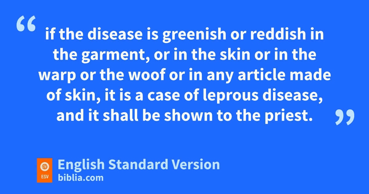 47 “When there is a case of leprous disease in a qgarment, whether a woolen or a linen garment, 48 in warp or woof of linen or wool, or in a skin or in anything made of skin, 49 if the disease is greenish or reddish in the garment, or in the skin or in the warp or the woof or in any article made of skin, it is a case of leprous disease, and it shall be shown to the priest. 50 And the priest shall examine the disease and shut up that which has the disease for seven days. 51 Then he shall examine the disease on the seventh day. If the disease has spread in the garment, in the warp or the woof, or in the skin, whatever be the use of the skin, the disease is a rpersistent leprous disease; it is unclean. 52 And he shall burn the garment, or the warp or the woof, the wool or the linen, or any article made of skin that is diseased, for it is a persistent leprous disease. It shall be burned in the fire.