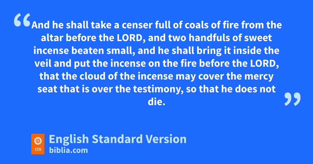 11 “Aaron shall present kthe bull as a sin offering for himself, and shall make atonement for himself and for his house. He shall kill the bull as a sin offering for himself. 12 And he shall take na censer full of coals of fire from the altar before the Lord, and two handfuls of sweet incense beaten small, and he shall bring it inside the veil 13 oand put the incense on the fire before the Lord, that the cloud of the incense may cover pthe mercy seat that is over the testimony, so that he does not die. 14 And qhe shall take some of the blood of the bull and sprinkle it with his finger on the front of the mercy seat on the east side, and in front of the mercy seat he shall sprinkle some of the blood with his finger seven times.