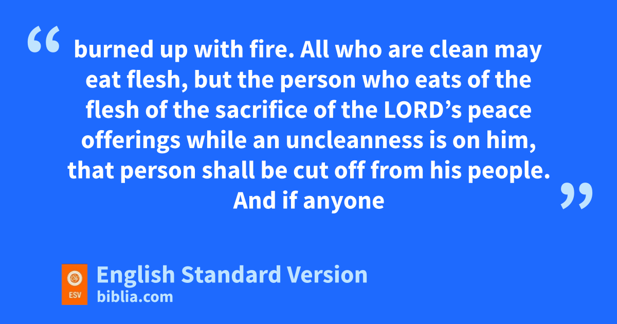 19 “Flesh that touches any unclean thing shall not be eaten. It shall be burned up with fire. All who are clean may eat flesh, 20 but the person who eats of the flesh of the sacrifice of the Lord’s peace offerings dwhile an uncleanness is on him, that person shall be cut off from his people. 21 And if anyone touches an unclean thing, whether ehuman uncleanness or an funclean beast or any gunclean detestable creature, and then eats some flesh from the sacrifice of the Lord’s peace offerings, that person shall be cut off from his people.”