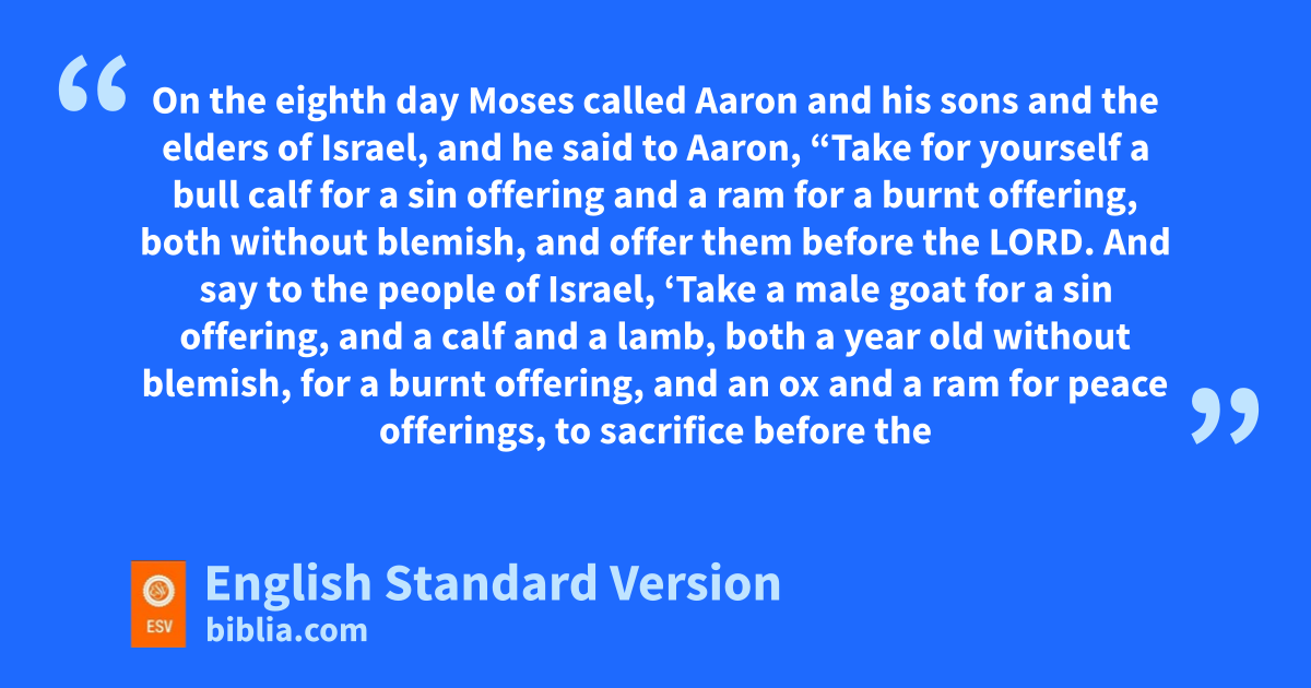 9 rOn the eighth day Moses called Aaron and his sons and the elders of Israel, 2 and he said to Aaron, s“Take for yourself a bull calf for a sin offering and ta ram for a burnt offering, both without blemish, and offer them before the Lord. 3 And say to the people of Israel, u‘Take a male goat for a sin offering, and a calf and a lamb, both a year old without blemish, for a burnt offering, 4 and an ox and a ram for peace offerings, to sacrifice before the Lord, and va grain offering mixed with oil, for wtoday the Lord will appear to you.’ ” 5 And they brought what Moses commanded in front of the tent of meeting, and all the congregation drew near and stood before the Lord. 6 And Moses said, “This is the thing that the Lord commanded you to do, that the glory of the Lord may appear to you.” 7 Then Moses said to Aaron, “Draw near to the altar and xoffer your sin offering and your burnt offering and ymake atonement for yourself and for the people, and bring the offering of the people and make atonement for them, as the Lord has commanded.”