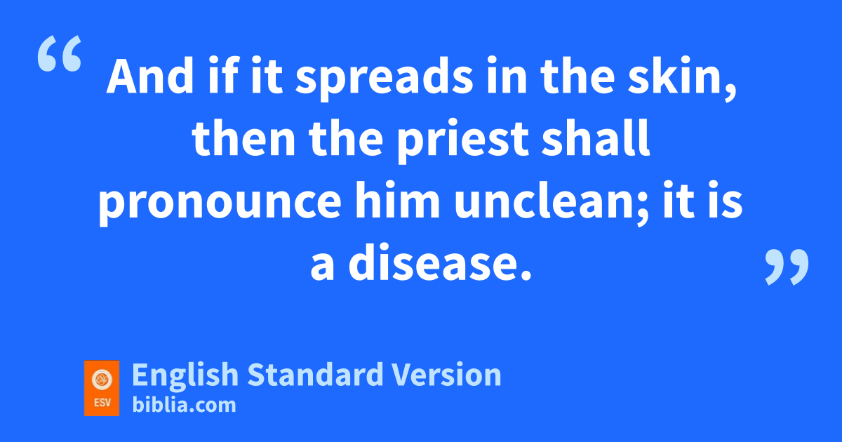 13 The Lord spoke to Moses and Aaron, saying, 2 “When a person has on the skin of his body a aswelling or an eruption or a spot, and it turns into a case of leprous1 disease on the skin of his body, bthen he shall be brought to Aaron the priest or to one of his sons the priests, 3 and the priest shall examine the diseased area on the skin of his body. And if the hair in the diseased area has turned white and the disease appears to be deeper than the skin of his body, it is a case of leprous disease. When the priest has examined him, he shall pronounce him unclean. 4 But if the spot is white in the skin of his body and appears no deeper than the skin, and the hair in it has not turned white, cthe priest shall shut up the diseased person for seven days. 5 And the priest shall examine him on the seventh day, and if in his eyes the disease is checked and the disease has not spread in the skin, then the cpriest shall shut him up for another seven days. 6 And the priest shall examine him again on the seventh day, and if the diseased area has faded and the disease has not spread in the skin, then the priest shall pronounce him clean; it is only an eruption. And dhe shall wash his clothes and be clean. 7 But if the eruption spreads in the skin, after he has shown himself to the priest for his cleansing, he shall appear again before the priest. 8 And the priest shall look, and if the eruption has spread in the skin, then the priest shall pronounce him unclean; it is a leprous disease.