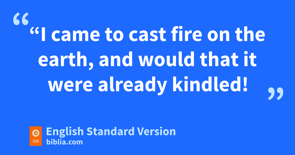 49 a“I came to cast fire on the earth, and would that it were already kindled! 50 bI have a baptism to be baptized with, and how cgreat is my distress until it is accomplished! 51 dDo you think that I have come to give peace on earth? eNo, I tell you, but rather division. 52 For from now on in one house there will be five divided, three against two and two against three. 53 They will be divided, ffather against son and son against father, mother against daughter and daughter against mother, mother-in-law against her daughter-in-law and daughter-in-law against mother-in-law.”