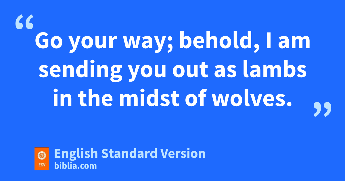 10 After this the Lord appointed xseventy-two1 others and ysent them on ahead of him, two by two, into every town and place where he himself was about to go. 2 zAnd he said to them, “The harvest is plentiful, but the laborers are few. aTherefore pray earnestly to the Lord of the harvest to send out laborers into his harvest. 3 Go your way; bbehold, I am sending you out as lambs in the midst of wolves. 4 cCarry no moneybag, no knapsack, no sandals, and dgreet no one on the road. 5 Whatever house you enter, first say, e‘Peace be to this house!’ 6 And if a son of peace is there, your peace will rest upon him. But if not, fit will return to you. 7 And remain in the same house, eating and drinking what they provide, for gthe laborer deserves his wages. Do not go from house to house. 8 Whenever you enter a town and they receive you, eat what is set before you. 9 Heal the sick in it and say to them, h‘The kingdom of God has come near to you.’ 10 But whenever you enter a town and they do not receive you, go into its streets and say, 11 i‘Even the dust of your town that clings to our feet we wipe off against you. Nevertheless know this, that jthe kingdom of God has come near.’ 12 I tell you, kit will be more bearable on lthat day for Sodom than for that town.