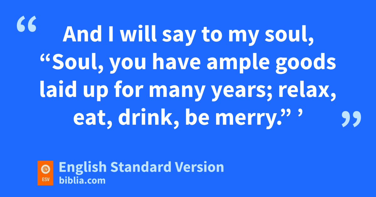 13 sSomeone in the crowd said to him, “Teacher, tell my brother to divide the inheritance with me.” 14 But he said to him, t“Man, uwho made me a judge or arbitrator over you?” 15 And he said to them, v“Take care, and be on your guard against all covetousness, for one’s life does not consist in the abundance of his possessions.” 16 And he told them a parable, saying, w“The land of a rich man produced plentifully, 17 and he thought to himself, x‘What shall I do, for I have nowhere to store my crops?’ 18 And he said, ‘I will do this: I will tear down my ybarns and build larger ones, and there I will store all my grain and my goods. 19 And I will say to my soul, “Soul, you have ample goods laid up zfor many years; relax, aeat, drink, be merry.” ’ 20 But God said to him, b‘Fool! zThis night cyour soul is required of you, and the things you have prepared, dwhose will they be?’ 21 So is the one ewho lays up treasure for himself and is not rich toward God.”