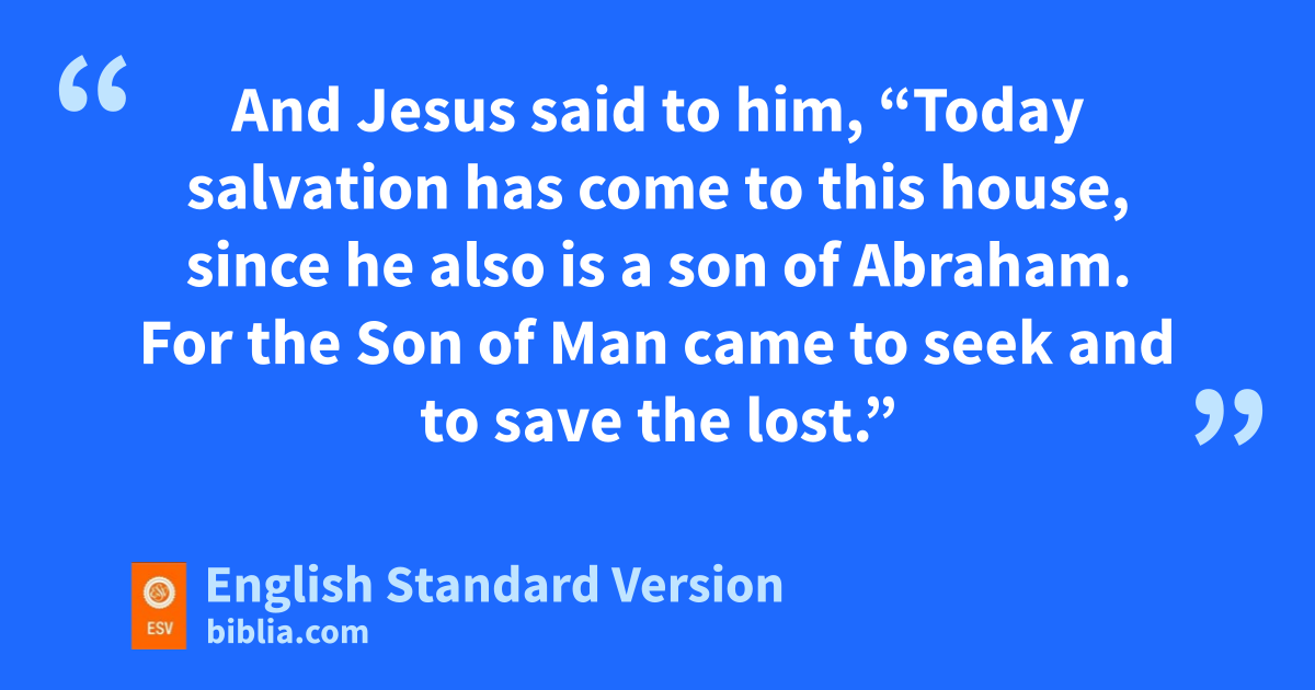 19 cHe entered Jericho and was passing through. 2 And behold, there was a man named Zacchaeus. He was a chief tax collector and was rich. 3 And dhe was seeking to see who Jesus was, but on account of the crowd he could not, because he was small in stature. 4 So he ran on ahead and climbed up into ea sycamore tree to see him, for he was about to pass that way. 5 And when Jesus came to the place, he looked up and said to him, “Zacchaeus, hurry and come down, for fI must stay at your house today.” 6 So he hurried and came down and greceived him joyfully. 7 And when they saw it, they all hgrumbled, “He has gone in to be the guest of a man who is a sinner.” 8 And Zacchaeus stood and said to the Lord, “Behold, Lord, the half of my goods iI give to the poor. And if I have jdefrauded anyone of anything, I restore it kfourfold.” 9 And Jesus said to him, “Today salvation has come to this house, since lhe also is a son of Abraham. 10 For mthe Son of Man came to seek and to save the lost.”