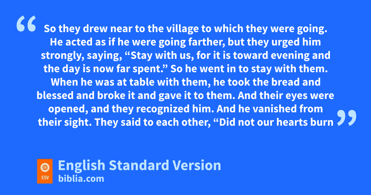 28 So they drew near to the village to which they were going. qHe acted as if he were going farther, 29 but they urged him strongly, saying, “Stay with us, for it is toward evening and rthe day is now far spent.” So he went in to stay with them. 30 When he was at table with them, he took the bread and sblessed and broke it and gave it to them. 31 tAnd their eyes were opened, and they recognized him. And uhe vanished from their sight. 32 They said to each other, v“Did not our hearts burn within us while he talked to us on the road, while he wopened to us the Scriptures?” 33 And they rose that same hour and returned to Jerusalem. And they xfound the eleven and ythose who were with them gathered together, 34 saying, “The Lord has risen indeed, and zhas appeared to Simon!” 35 Then they told what had happened on the road, and ahow he was known to them in bthe breaking of the bread.