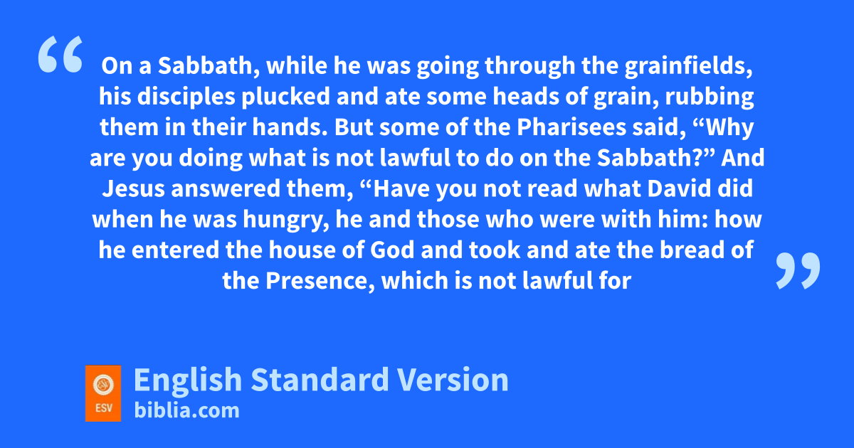 6 sOn a Sabbath,1 while he was going through the grainfields, his disciples tplucked and ate some heads of grain, rubbing them in their hands. 2 But some of the Pharisees said, u“Why are you doing vwhat is not lawful to do on the Sabbath?” 3 And Jesus answered them, w“Have you not read xwhat David did when he was hungry, he and those who were with him: 4 how he entered the house of God and took and ate ythe bread of the Presence, ywhich is not lawful for any but the priests to eat, and also gave it to those with him?” 5 And he said to them, z“The Son of Man is lord of the Sabbath.”