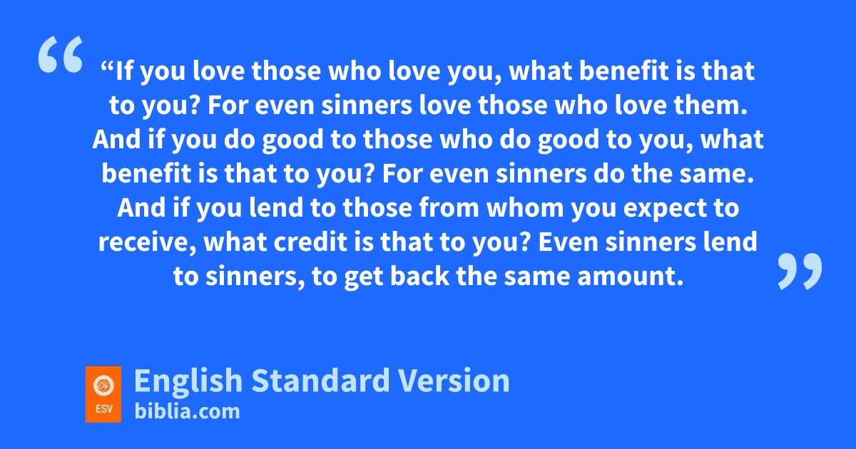 32 z“If you love those who love you, what benefit is that to you? For even sinners love those who love them. 33 And if you do good to those who do good to you, what benefit is that to you? For even sinners do the same. 34 And aif you blend to those from whom you expect to receive, what credit is that to you? Even sinners lend to sinners, to get back the same amount. 35 But clove your enemies, and do good, and lend, expecting nothing in return, and your reward will be great, and dyou will be sons of ethe Most High, for fhe is kind to the ungrateful and the evil. 36 gBe merciful, even as hyour Father is merciful.