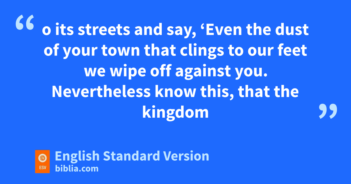 10 After this the Lord appointed xseventy-two1 others and ysent them on ahead of him, two by two, into every town and place where he himself was about to go. 2 zAnd he said to them, “The harvest is plentiful, but the laborers are few. aTherefore pray earnestly to the Lord of the harvest to send out laborers into his harvest. 3 Go your way; bbehold, I am sending you out as lambs in the midst of wolves. 4 cCarry no moneybag, no knapsack, no sandals, and dgreet no one on the road. 5 Whatever house you enter, first say, e‘Peace be to this house!’ 6 And if a son of peace is there, your peace will rest upon him. But if not, fit will return to you. 7 And remain in the same house, eating and drinking what they provide, for gthe laborer deserves his wages. Do not go from house to house. 8 Whenever you enter a town and they receive you, eat what is set before you. 9 Heal the sick in it and say to them, h‘The kingdom of God has come near to you.’ 10 But whenever you enter a town and they do not receive you, go into its streets and say, 11 i‘Even the dust of your town that clings to our feet we wipe off against you. Nevertheless know this, that jthe kingdom of God has come near.’ 12 I tell you, kit will be more bearable on lthat day for Sodom than for that town.