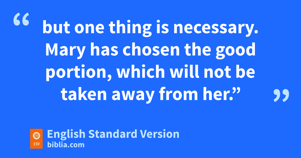 38 Now as they went on their way, Jesus4 entered a village. And a woman named bMartha cwelcomed him into her house. 39 And she had a sister called bMary, who dsat at the Lord’s feet and listened to his teaching. 40 But Martha was distracted with much serving. And she went up to him and said, “Lord, do you not care that my sister has left me to serve alone? Tell her then to help me.” 41 But the Lord answered her, “Martha, Martha, you are eanxious and troubled about many things, 42 but one thing is necessary.5 Mary has chosen fthe good portion, which will not be taken away from her.”