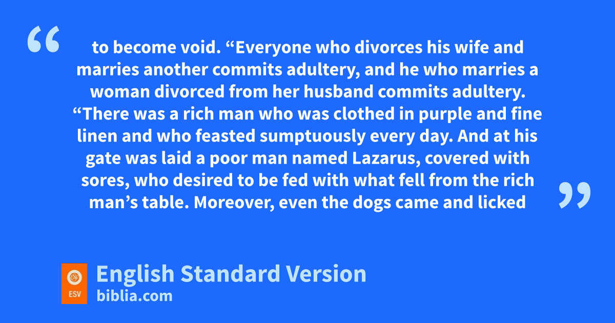 19 “There was a rich man who was clothed in epurple and fine linen and fwho feasted sumptuously every day. 20 And at his gate gwas laid a poor man named Lazarus, covered with sores, 21 who desired to be fed with hwhat fell from the rich man’s table. Moreover, even the dogs came and licked his sores. 22 The poor man died and was carried by ithe angels jto Abraham’s side.6 The rich man also died and was buried, 23 and in kHades, being in torment, he lifted up his eyes and lsaw Abraham far off and Lazarus jat his side. 24 And he called out, m‘Father Abraham, have mercy on me, and send Lazarus to dip the end of his finger in water and ncool my tongue, for oI am in anguish in this flame.’ 25 But Abraham said, ‘Child, remember that pyou in your lifetime received your good things, and Lazarus in like manner bad things; but now he is comforted here, and you are in anguish. 26 And besides all this, between us and you a great chasm has been fixed, in order that those who would pass from here to you may not be able, and none may cross from there to us.’ 27 And he said, ‘Then I beg you, father, to send him to my father’s house— 28 for I have five brothers—so that he may warn them, lest they also come into this place of torment.’ 29 But Abraham said, ‘They have qMoses and the Prophets; rlet them hear them.’ 30 And he said, ‘No, sfather Abraham, but if someone goes to them from the dead, they will repent.’ 31 He said to him, ‘If they do not hear qMoses and the Prophets, tneither will they be convinced if someone should rise from the dead.’ ”